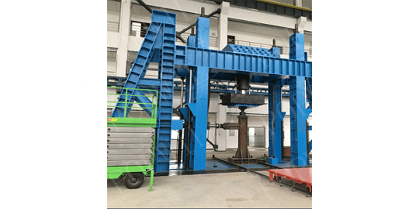 2、该系统竖向(垂向)荷载2000kN,侧向(水平)荷载800kN,加载框架为两立柱龙门式框架自反力结构,上下横梁各一支,立柱四支,上下横梁采用箱型钢梁制作。上下横梁高度可按模数调节,上下横梁工作面安装平行直线导轨,导轨上安装可任意移动的小车平台,以安装加载点及支座。移动立柱、移动竖梁可安装在下横梁的轨道上或侧面,位置任意可调,以方便进行不同类型的实验;配有旋转式电动固定吊车1台,起重吨位≥1吨。四立柱自反力框架结构,移动加载横梁与四立柱无间隙紧密连接,试验空间可调。控制器可实现多通道协调加载,保证垂向加载点和水平加载点具有很好的随动能力。